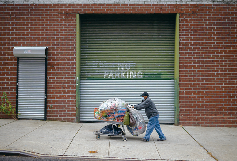 明居正說,中共統戰的「低綱領中的低綱領」,其中之一就是社會人道主義。圖為2021年10月美國布魯克林區內,以回收為生的民眾。(Ed JONES / AFP)