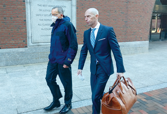 明居正表示,最令他震驚的是,美國哈佛大學化學系系主任查爾斯.利伯(Charles Lieber)被中共統戰成功。利伯涉嫌替中國從事間諜活動,2020年1月被美國政府逮捕。圖為利伯(左)與律師於2021年12月17日走出波士頓聯邦法庭。(劉景燁/大紀元)