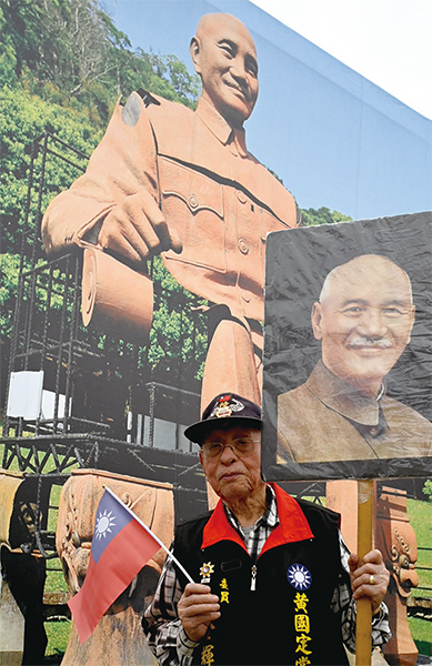 蔣中正對臺灣最大貢獻就是排除共產主義在臺灣之外,然而「下一個蔣中正在哪裡?」圖為2019年4月5日,臺北中正紀念堂前,一位退伍軍人舉著蔣中正像。(Sam Yeh / AFP)