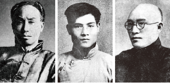 1921年7月23日,在共產國際的資助下,中國共產黨在上海舉行第一次全國代表大會,最後一天會議移至嘉興南湖舉行,會議選舉陳獨秀(左)、張國燾(中)、李達(右)三人組成的中央局為領導機搆。 (維基百科)