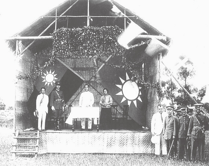 1924年5月在廣州黃埔建立黃埔軍校。蔣介石任校長,廖仲愷任黨代表。圖為1924年6月16日孫中山(左三)在黃埔軍校開學典禮演講,在場的還有宋慶齡(左四)、蔣介石(左二、廖仲愷(左一)。(公有領域)