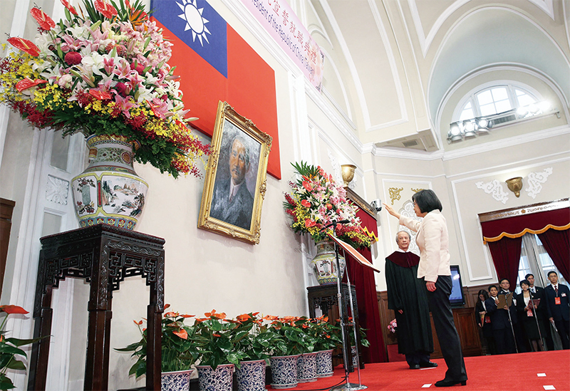中華民國總統蔡英文就職之後,中共官方不斷釋出「不統一就武統」的暗示,臺灣部分政治人物、或媒體人不斷唱和,助中共恐嚇臺灣人民。圖為2016年5月20日蔡英文在總統府宣誓就職。(POOL / AFP)