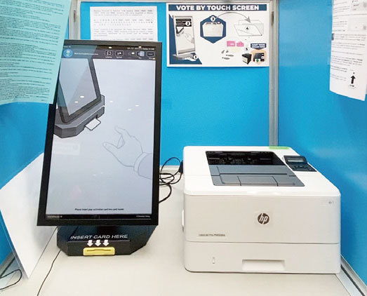拜登在致詞中強調要花錢推廣以選舉誠信、科技在選舉中的應用,實則是Dominion選舉機器的普遍使用。圖為Dominion觸屏投票機。(李文淨/大紀元)