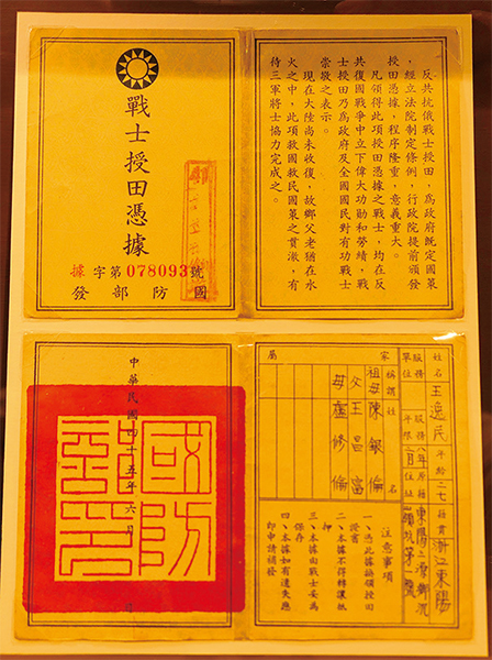 臺灣60年代實施《反共抗俄戰士授田條例》,先發給服役滿兩年以上戰士或遺眷「戰士授田憑據」,1957年開始在宜蘭大同農場進行首次授田供榮民開墾。(Pbdragonwang /維基百科)