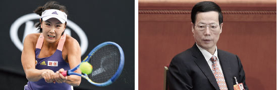 中國網球運動員彭帥(右)在指控中共副總理張高麗(左)對她進行性虐待後失蹤了。彭帥沒能追究施虐者的責任,而是被迫撤回指控,並被迫在安排好的視頻中公開露面。(Getty Images)