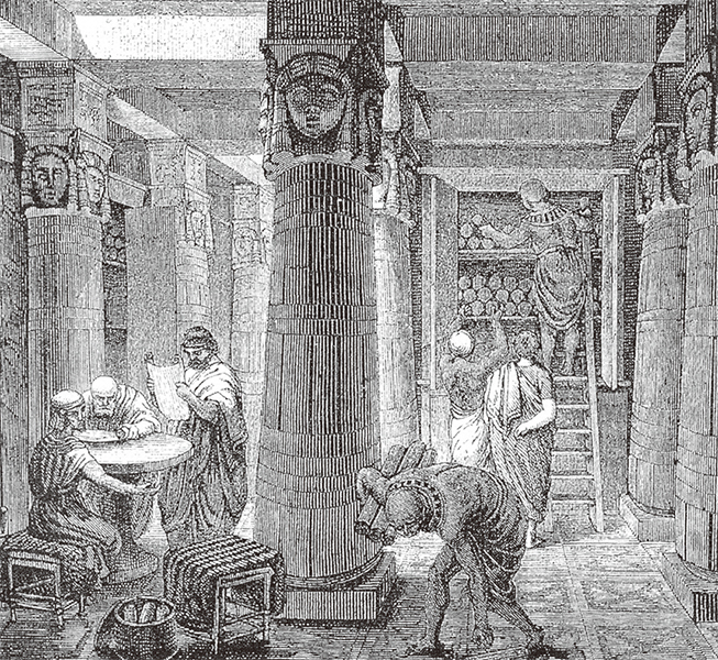埃及的亞歷山大圖書館是最著名的古代圖書館。圖為亞歷山大圖書館內部想像圖。(公有領域)