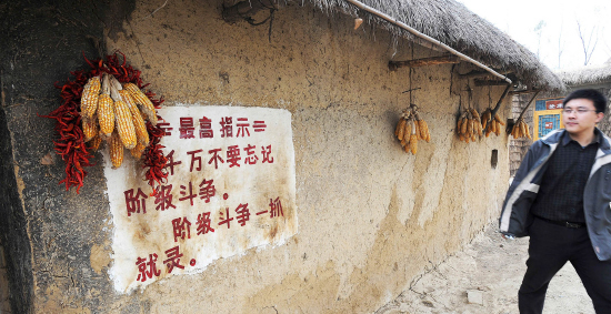 中共將中國傳統社會結構全部解體,將中共自己的黑社會組織特性侵蝕到每一個社會細胞中。圖為安徽省小崗村一戶古老的村屋牆上鼓動階級鬥爭的標語。(STR / AFP)