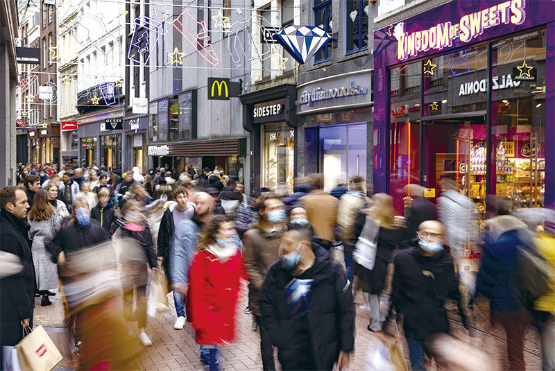 今天政客們仍抱著消滅病毒的野心,戴著口罩,並使用荒謬的策略來假裝追蹤、記錄和孤立所有人。圖為2021年11月6日,阿姆斯特丹,人們戴著口罩逛購物街。(Ramon van Flymen / ANP / AFP)