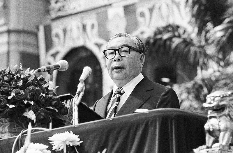 1972年6月30日,蔣經國向立法院報告未來施政方針指出,對中華民國來講,唯一的衝突,是三民主義仁政與共產主義暴政的衝突;唯一的戰爭,是反共戰爭。圖為1979年10月10日,蔣經國總統主持中華民國國慶大會。(外交部提供)