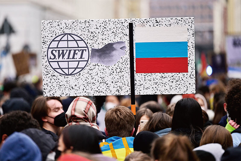 2022 年3 月3 日,在柏林舉行的反對烏克蘭戰爭的示威活動中,一個支持將俄羅斯逐出SWIFT 系統的標誌。