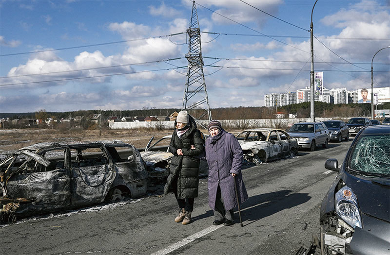 在「壞」的情況下,戰爭會延續很長時間,這將對全球糧食和能源價格、供應鏈以及金融體系產生嚴重影響。圖為2022 年3 月10 日烏克蘭伊爾平市居民逃離淪為戰場的家園。(Aris Messinis/AFP)