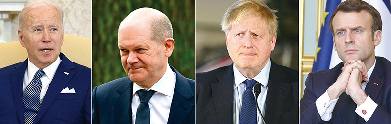 自由世界聯合對俄羅斯實施了三個層面的制裁措施。圖為美國總統拜登、德國總理肖爾茨、英國總理約翰遜以及法國總理馬克龍(由左而右)在3月7日的視訊會議後表示,誓言進一步懲罰俄羅斯入侵烏克蘭(Tobias Schwarz, Jim Watson, Leon Neal, Ludovic Marin / AFP)。