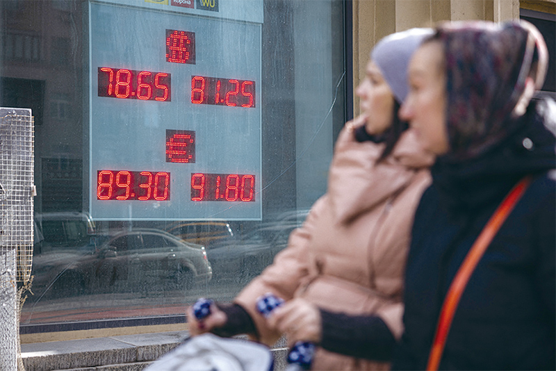 俄羅斯盧布自戰前已貶值三成。圖為2月22日,莫斯科婦女走過一個顯示美元和歐元兌俄羅斯盧布匯率的板子。(Dimitar Dilkoff / AFP)