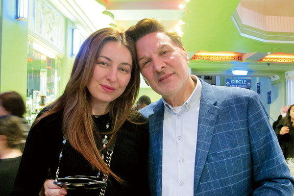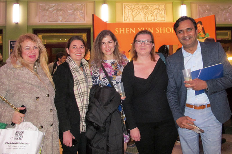 2022年3月12日晚,在英國倫敦漢默史密斯阿波羅劇院,獲獎製片人兼主持人Faisal Shaukat(右)與演員兼製片人Charmaine Wohlmann(左)等一行五人一同觀看了神韻世界藝術團的精采演出。(攝影/麥蕾)