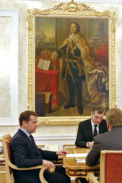 普京最佩服的人是彼得大帝,從2000年掌權俄羅斯之後,普京便把彼得大帝的畫像掛在辦公室。圖為2012年7月9日俄羅斯總理梅德韋傑夫(左)出席在莫斯科舉行的會議,牆上掛有彼得大帝的肖像。(Dmitry Astakhov / Ria-Novosti / AFP)