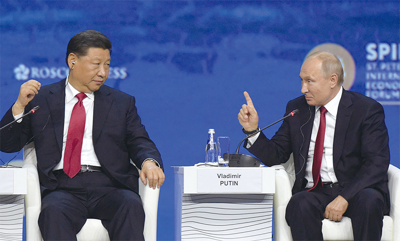 2019年6月7日出席聖彼得堡經濟論壇時,習近平和普京同臺。(Olga Maltseva / AFP)