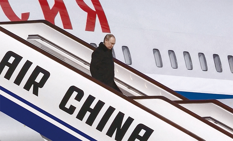 普京是北京冬運會開幕式上唯一的大國領袖,給習近平捧場,此次會晤後公布聯合聲明稱,中俄兩國「友誼無止境,合作無禁區」。圖為2022年2月4日普京抵達北京。(STR / AFPTV / CCTV / AFP)