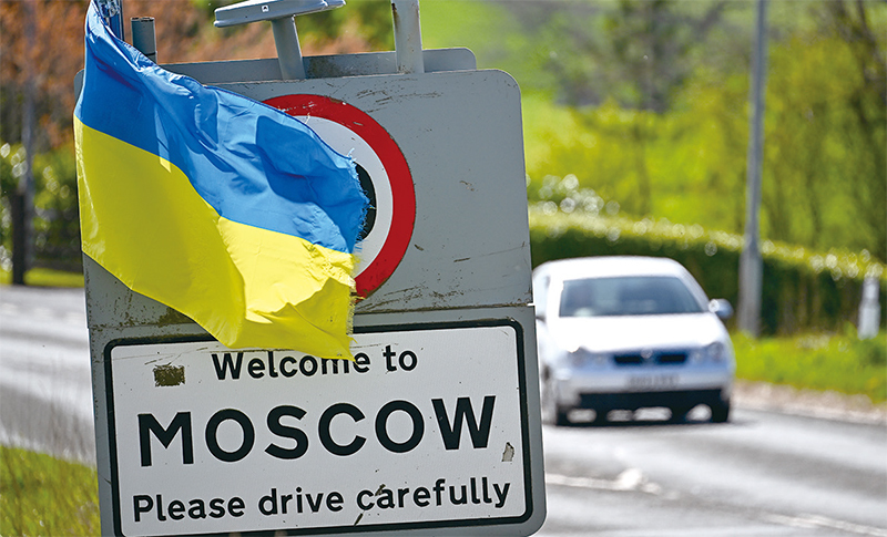 烏克蘭頑強抵抗住俄軍的突襲,贏得國際社會的支持。圖為2022年4月20日,在蘇格蘭東艾爾郡的一個小村莊莫斯科,烏克蘭國旗懸掛在路標上。(Jeff J Mitchell / Getty Images)