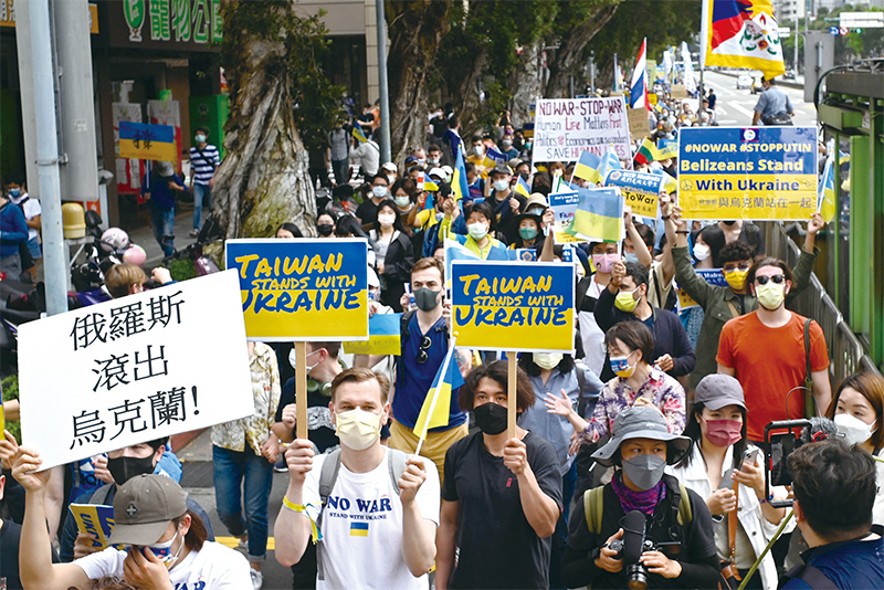 2022年3月13日,臺灣人在臺北舉行集會遊行抗議俄羅斯發動侵略烏克蘭的戰爭。(Sam Yeh / AFP)