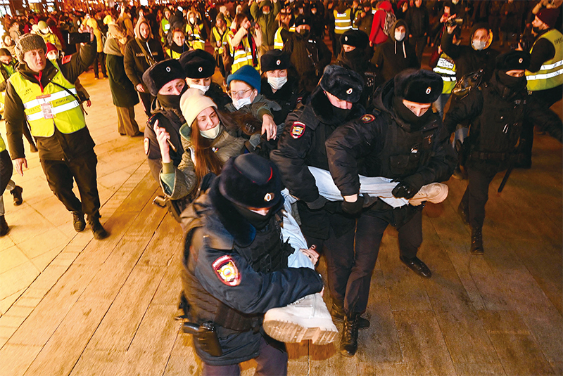 2022年2月24日,莫斯科警察在俄羅斯民眾反戰抗議現場,拘留了一名婦女。據非政府組織OVD-Info稱,當天俄羅斯至少有1849人因參與抗議活動而被捕。(Kirill Kudryavtsev / AFP)
