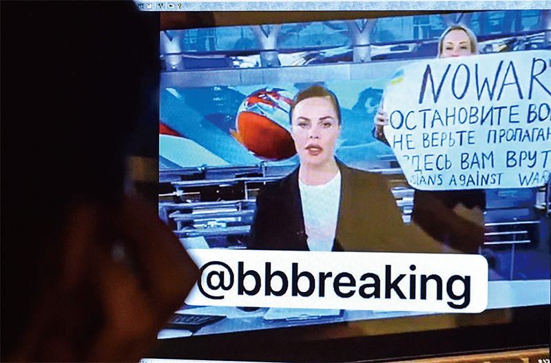 3月14日,俄羅斯國家電視臺員工瑪麗亞.奧夫斯揚尼科娃舉著反戰標語闖進了直播間,抗議俄羅斯發動侵略烏克蘭的戰爭,打斷了這家俄羅斯主要國家電視臺黃金時段的新聞節目。標語牌寫道:「不要戰爭。停止戰爭。不要相信他們在這裡告訴你的謊言。」烏克蘭總統澤連斯基表示,「我個人也要感謝那個拿著反戰海報走進第一頻道演播室的女子。」他感謝那些敢於說出俄羅斯入侵烏克蘭「真相」的俄羅斯人。