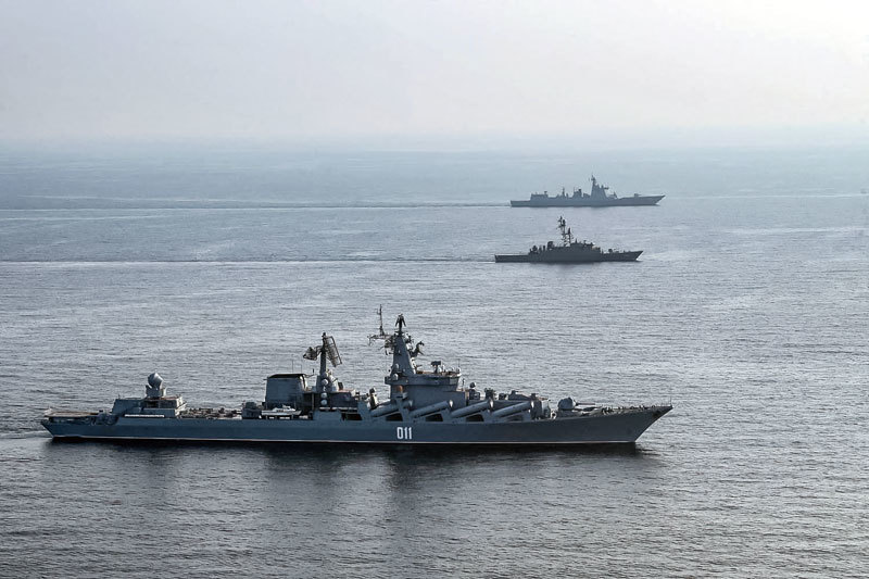 如果西方只針對俄羅斯,勢必讓中共成為制裁的主要受益者,從而幫助中共實現取代美國成為世界第一強國。圖為1月21日,在伊朗軍隊官方網站上顯示伊朗、俄羅斯和中共軍艦在印度洋的軍事演習。(Iranian Army office/AFP)