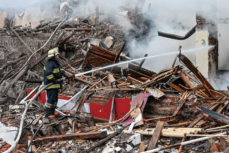 因為普京「對烏克蘭的悲慘入侵」,情報界就普京的計畫提供過充分的警告,美國官員也與世界分享了這些情報。圖爲4月12日,烏克蘭第二大城市哈爾科夫市,一位消防員正在給因被導彈擊中而引起大火的樓房滅火。(Sergey Bobok/AFP)