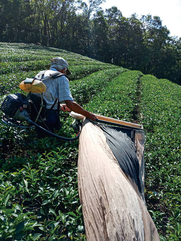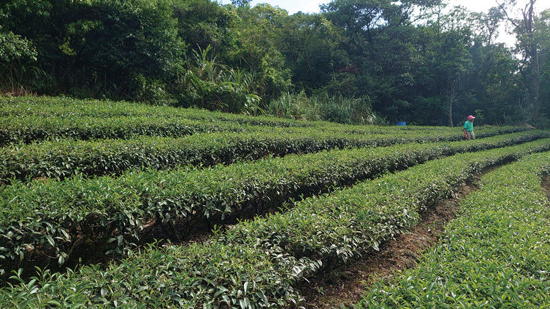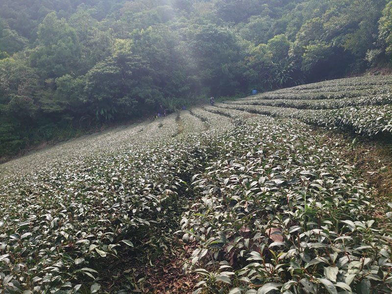 還發現了為什麼他的茶乾淨、醇厚、好喝?老先生的茶園散布在不同的山坡地,最大的一塊茶園,圍繞在一片森林裡,晨昏瀰漫著霧氣山嵐,到了中午是大豔陽天,這是種植茶樹最好的環境。老先生不用也沒有多餘的力氣噴灑農藥,他說有多少算多少,全是靠手工,只有在採收時才用簡單的機器,因為找不到採茶人。