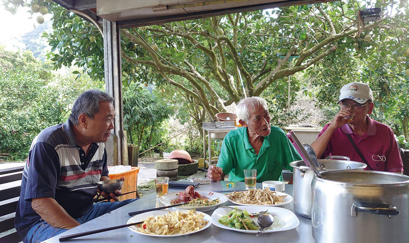 詹老先生與訪客品嘗自家菜園摘的菜。