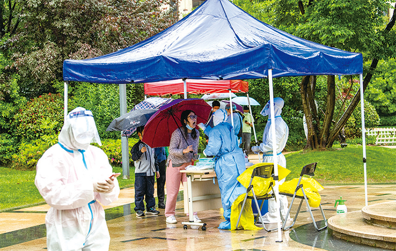 2022年5月13日,上海浦東區居民在一個被封鎖的大院內接受核酸檢測。(Liu Jin / AFP)