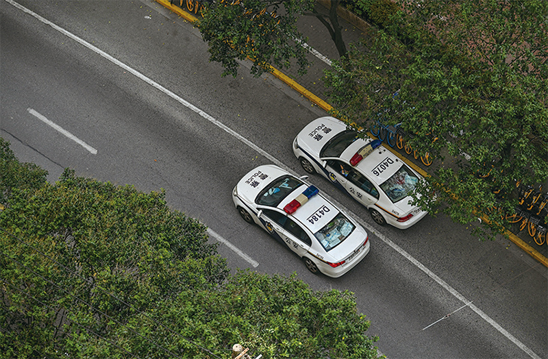上海「清零」亂象紛呈,外界普遍認為背後涉及20大前夕習江權鬥的決戰。圖為2022年4月12日,上海封城期間,靜安區街上兩輛警車。(Hector Retamal / AFP)