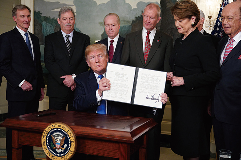 特朗普政府於2018年開始對中共發起貿易戰和科技戰。圖為2018年3月22日,特朗普簽署了對中國的貿易制裁。(Mandel Ngan / AFP)