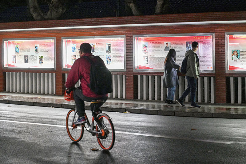中共政權在高校施行威權管制,便於掌控中國的高等教育。圖為2019年12月18日上海復旦大學校園內的看板,充滿中共政治標語。(Hector Retamal / AFP)