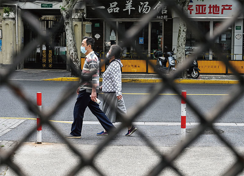 香港經濟學者研究認為,如果中國十分之一的城市被迫封城兩周,當月中國GDP可能損失3.1%。圖為5月19日,在上海靜安區,透過被封鎖的大院圍欄看到的冷清街道。(Hector Reramal / AFP)