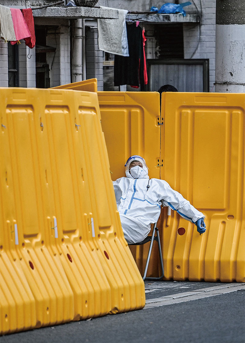 與病毒共存在海外已成為一個成功抗疫模式,中共仍不惜付出經濟衰退和民怨沸騰的代價也要達成「清零」。圖為2022年3月29日,在上海靜安區,一名身穿防護裝備的工人在封鎖社區的入口處守衛。(Hector Retamal / AFP)