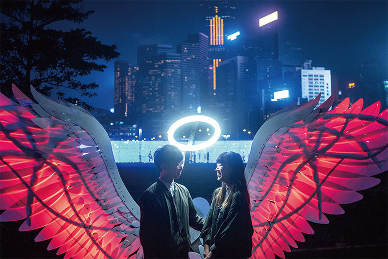 在一些相對保守的地區,傳統的信仰得到了較好的保持,人們相信生命中神的安排。圖為2018年12月2日,香港閃躍維港燈影節中一個自由天使裝置。(Philip Fong / AFP)