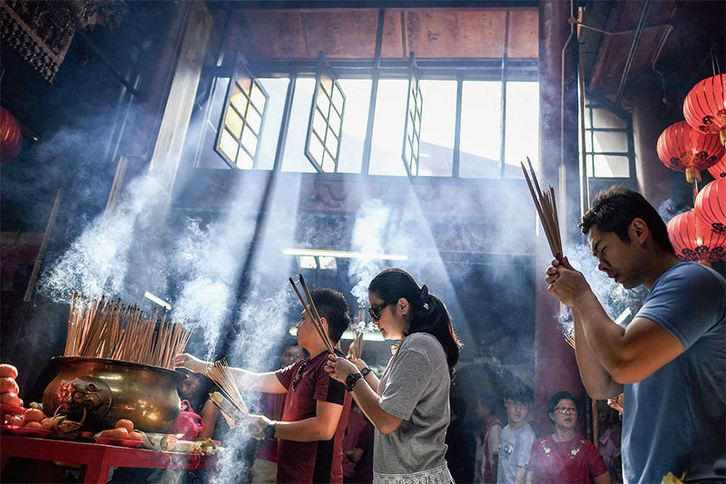 佛家和道家的生死觀與西方的宗教在面對疫情時能起到異曲同工的妙用。圖為馬來西亞華人在吉隆坡唐人街一道觀焚香祈禱。