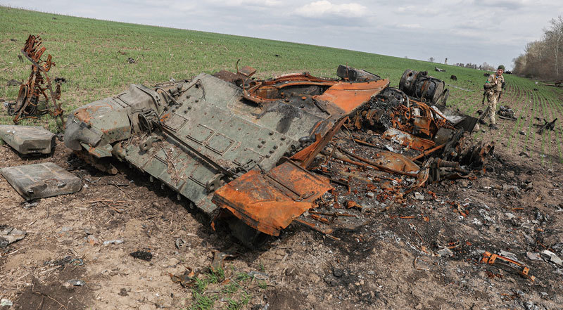 戰爭中被迅速消耗的俄軍已不可能贏得這場與整個西方對抗的代理戰爭。圖為2022年4月16日,烏克蘭古薩羅夫卡村附近被摧毀的俄羅斯坦克。(Anatolii Stepanov / AFP)