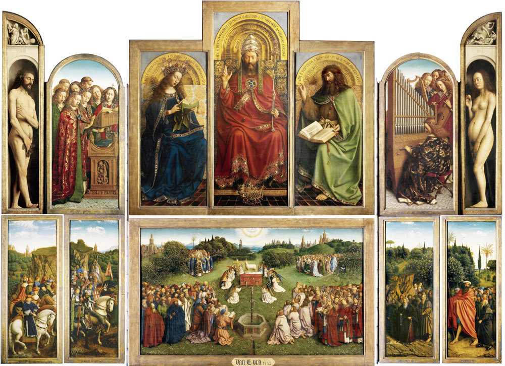 〈根特祭壇畫〉內含12個面板,是佛蘭德斯藝術家揚.范艾克的傑作。該作品創作於1432年,遠早於意大利文藝復興時期。現藏於比利時根特市的聖巴夫大教堂。(公有領域)