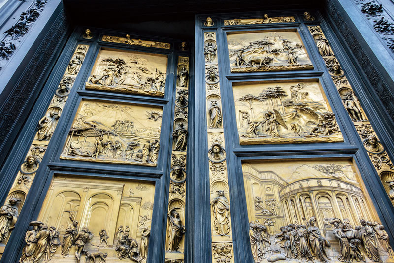 洛倫佐.吉貝爾蒂雕塑的大門,是我最常回去欣賞的一件藝術作品,因為它的壯麗,在看第一眼就令我震撼。米開朗基羅曾將其描述為「美麗得足以成為通往天堂的大門」。此外,這扇門特別令人印象深刻的是,門上的面板描繪出亞當和夏娃的創造:亞當正處於半意識狀態,身體騰空升起觸摸上帝而被賦予生命。