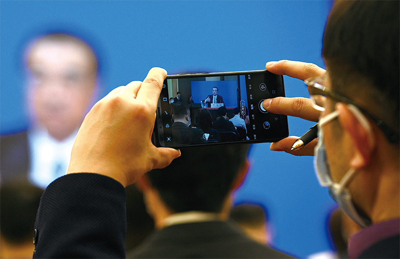 5月25日,李克強主管的國務院舉行了十多萬人參加的「全國穩住經濟大盤電視電話會議」。圖為2021年3月11日,中共人大會議閉幕後的國務院新聞發布會上,李克強通過視頻直播講話。(Noel Celis / AFP)