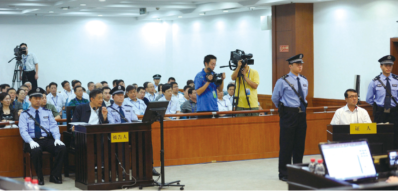 溫家寶替習近平打擊江派立了大功,為拿下薄熙來鋪平道路。圖為2013年8月24日,薄熙來(左)案關鍵證人、原重慶市公安局長王立軍(右)出庭作證。(China Out AFP Photo / Jinan Intermediate People's Court)