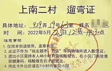上海居民進出小區,除了持有官方給予的健康碼、核酸報告外,還須持有「遛彎證」,且出行時間僅限二小時內。(微博圖片)