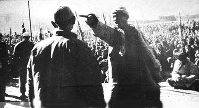中共奪取政權後,利用「土改、鎮反」運動殺地主,消滅地主階級。圖為1946年,一位農民正在鬥地主。(公有領域)