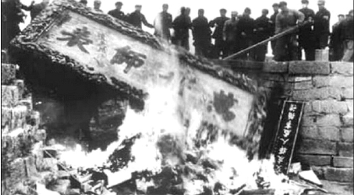 共產黨不相信神靈,且反對傳統道德,是個地道的邪教。「文化大革命」把傳統文化連根鏟除。圖為孔子萬世師表匾在「文革」中被焚毀。(資料圖片)