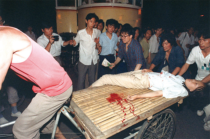 「六四」鎮壓撲滅了中國人對民主自由的嚮往。圖為1989年6月4日,在鎮壓中受傷的女孩被抬上推車。(Manuel Ceneta / AFP)