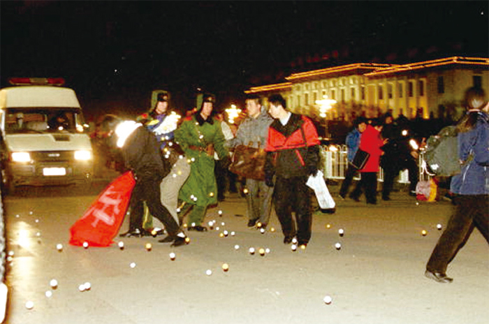 1999起,江澤民發動一場滅絕人性的大迫害,把信仰「真、善、忍」的法輪功學員打成敵人,至今無法收場。圖為2000年12月31日,公安在北京天安門廣場逮捕請願的法輪功學員。(Stringer / Getty Images)
