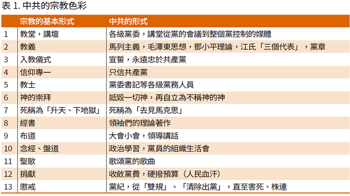 談及中共是邪教,邪惡的宗教,很多人可能從來沒有這樣想過,因為中共口口聲聲反對宗教,但實際上中共具備了宗教的所有要素。《九評共產黨》給出了一張對照表(表1):
