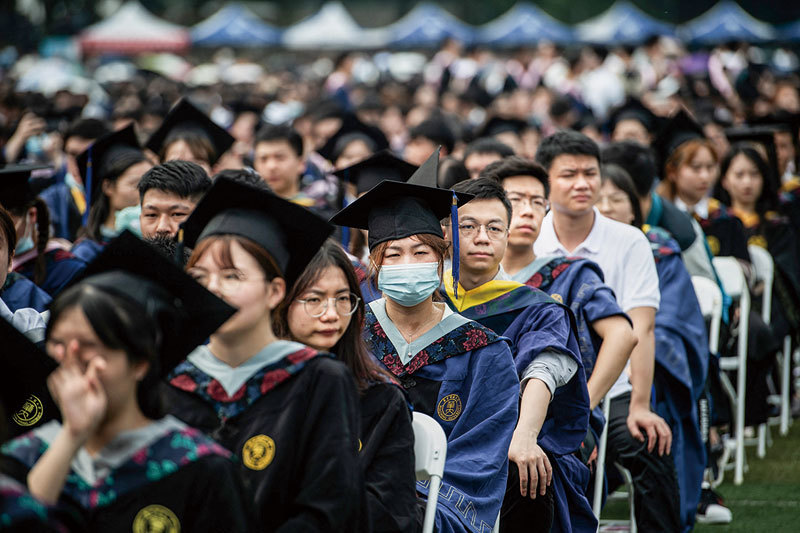 大學畢業即失業成了年輕人當前避不開的魔咒。圖為2021年6月13日湖北武漢華中師範大學舉行的畢業典禮。(STR / AFP)