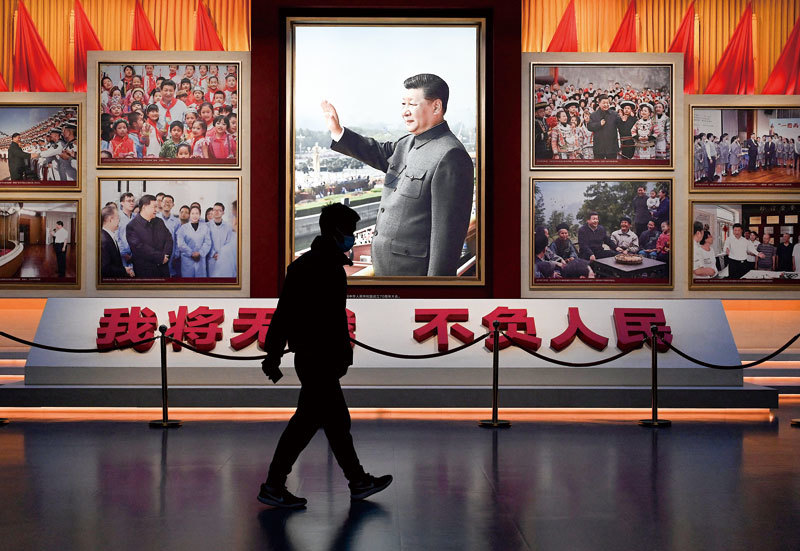 一位在美國攻讀博士的中國學生認為,年輕人入黨是為了得到自己的好處。圖為2021年11月11日,一名男子走在北京中國共產黨博物館內。(Noel Celis / AFP)